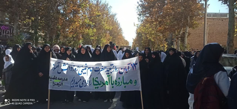 طلاب مدارس علمیه خواهران استان اصفهان همزمان با سراسر کشور، در راهپیمایی باشکوه ۱۳ آبان با حضوری گسترده و انقلابی، بار دیگر وفاداری خود را به آرمانهای امام خمینی(ره) و مقام معظم رهبری اعلام کردند.